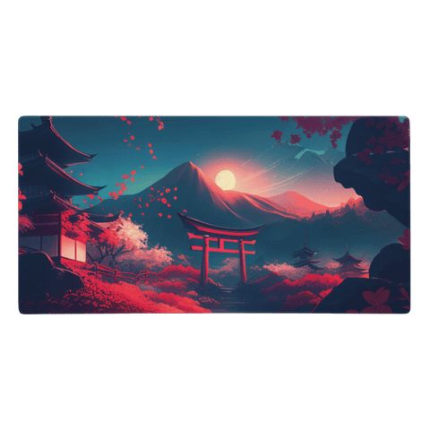 Le tapis de souris japonais soleil levant sakura met en avant un paysage poétique où la lumière du soleil illumine un torii traditionnel entouré de cerisiers en fleurs. Les couleurs rouges et rosées créent une atmosphère chaleureuse et relaxante qui transforme instantanément votre setup en un espace inspirant.