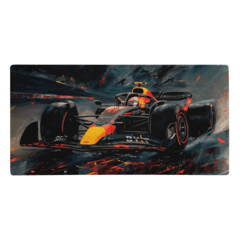 Ce tapis de souris Red Bull F1 se distingue par son visuel spectaculaire : une monoplace noire et orange surgissant sur un circuit nocturne, entourée d’effets lumineux et de projections intenses. L’ambiance sombre contrastée par des touches flamboyantes renforce la sensation de mouvement et d’adrénaline.